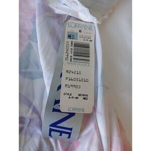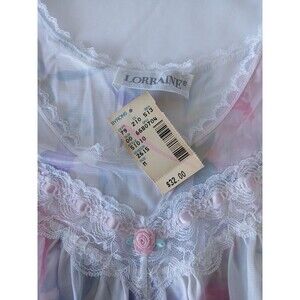 The Lorraine pink floral 100% Nylon Midi Length Embellished Neck Nightgown in size medium is a vintage piece from the 1980s. Made in the United States, this nightgown features a Victorian look with an embellished neckline, perfect for adding a touch of elegance to your bedtime routine. The soft peach color and nylon material make it a comfortable and stylish choice for women looking for a unique and timeless piece of sleepwear.