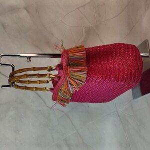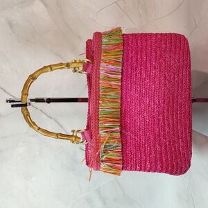 Super cute bright pink woven straw satchel bag with braided trim, multi color nylon raffia fringe and double bamboo top handles.