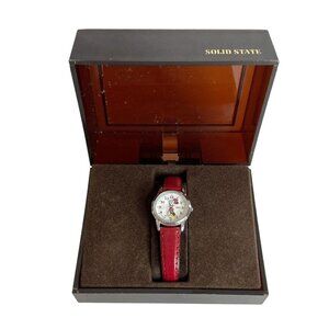 This stunning Lorus watch features the beloved Disney character Minnie Mouse on the dial, perfectly capturing her charm and whimsy. The watch has a beautiful gold tone finish and comes with a striking red leather band that really makes it stand out. It is a great addition to any Disney or watch collection.