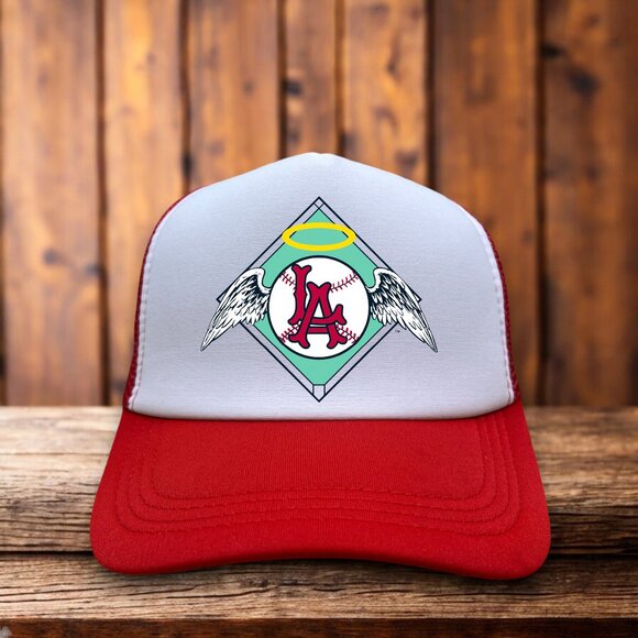 Los Angeles Angels Mens Trucker Hat Red Snapback 1961 Logo Throwback Baseball