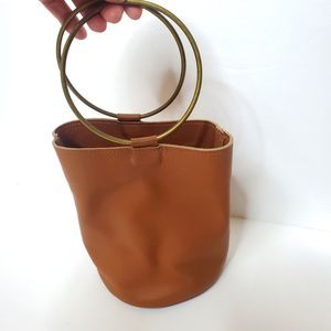 Stylish tan clutch with unique gold ring handles. Perfect for a chic look.