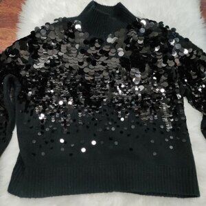 This stylish black turtleneck sweater features sequin embellishments, offering a unique and dazzling look for cooler weather.
