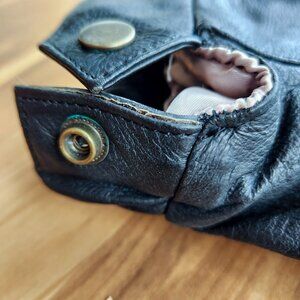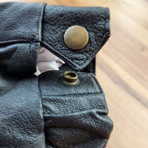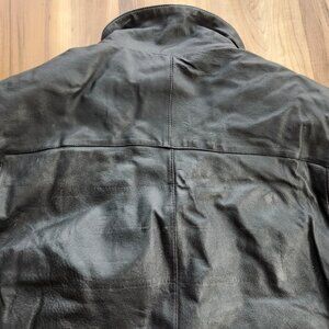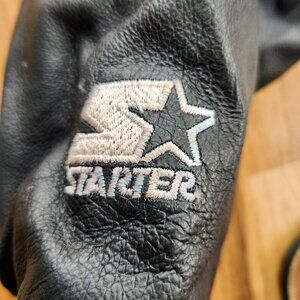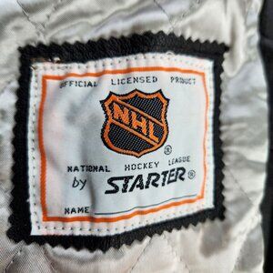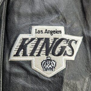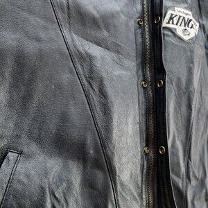 Silver/Black vintage 1990s L.A. Kings leather starter jacket. Leather is in excellent supple condition, and not at all dried out or cracked. Zipper and snaps function perfectly, quilted lining is in fantastic shape. Only real imperfection is a small rust-colored stain above inner pocket (see photo).