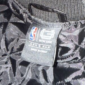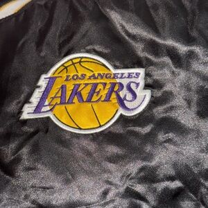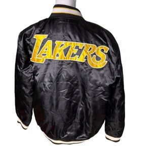 Sleek black satin Los Angeles Lakers bomber with yellow & white striped trim. Embroidered logo on the front + bold LAKERS lettering across the back.