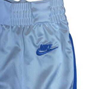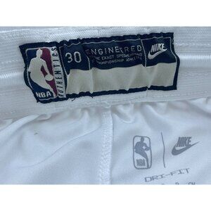 Nike Men's White & Blue Basketball Shorts feature authentic NBA logo embroidery and a signature Nike swoosh. Made from lightweight polyester material, they have an elastic waistband for comfort and mobility. They are designed for performance and casual wear, offering athletic style and versatility.