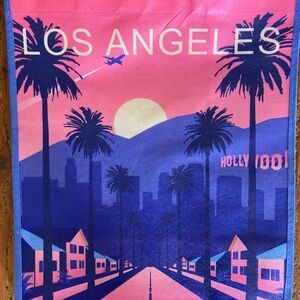 This is a new bag from Whole Foods. Reusable, washable, made from recycled plastic bottles. Perfect for your groceries and comes in a fun pink and blue color scheme with palm trees and the Hollywood sign. Measurements are approximate.