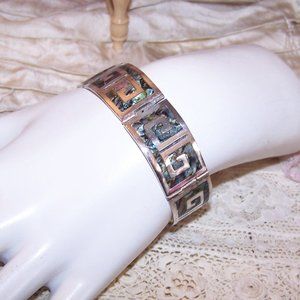 Dating to the 1950s/1960s or so, here's a Sterling Silver (hallmarked as pictured) link bracelet by Los Ballesteros of Taxco, Mexico. The bracelet features a Greek Key design with sections inlaid with slabs of abalone shell. The bracelet links are slightly curved and while the piece has a length of 7-1/8", the wearable length is 6-3/4". Width of the panels is 11/16"; weight is 22.6 grams. Tongue in slide clasp that works as it should. No Eagle Mark. Excellent condition with no problems to the shell inlay. Nice shine to the silver though the reverse could use a touch more polishing to take out some stray bits of tarnish.