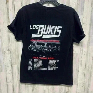 Show off your love for Los Bukis with this black T-shirt from their 2021 tour collection. Available in size medium, this unisex shirt is perfect for any fan of the renowned band. The shirt features the tour's iconic logo on the front and is made of high-quality materials that ensure comfort and durability.