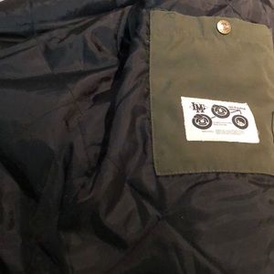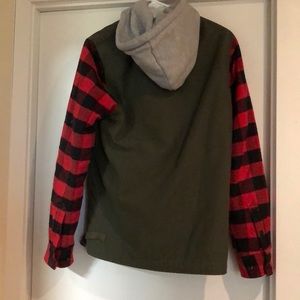 This Loser Machine jacket is fully quilted inside with a great mixed medium of flannel sleeves with an army green body. The grey hood is also removable. Great condition! Fits like a men’s small or a women’s medium.
