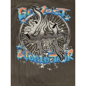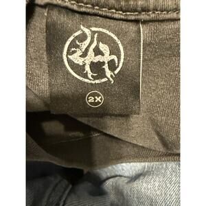 The Lost Hills Get Lost World Tour Tee is a men's 2X gray shirt featuring a front and back print with a crew neck and short sleeves. Made from heavyweight cotton knit fabric, this limited edition shirt is easy to care for and perfect for wearing in summer, fall, or spring. The shirt showcases a graphic print logo with a grunge, funny, and gothic theme, ideal for fans of the Lost Hills band. Made in the United States, this relaxed fit shirt is machine washable and represents a unique addition to any wardrobe. New