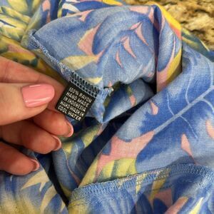 This dress is a breezy and vibrant tropical-inspired piece. It features a flowy silhouette with spaghetti straps, making it perfect for warm weather. The fabric showcases a bold and colorful print with shades of blue, yellow, pink, and green, depicting tropical leaves and foliage for a lively, summery feel. The neckline is gathered slightly for a relaxed and flattering look. This dress is ideal for casual outings, beach days, or vacation wear