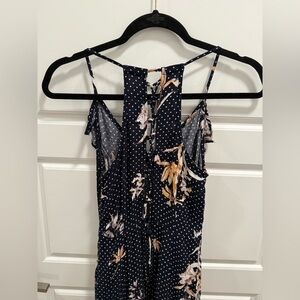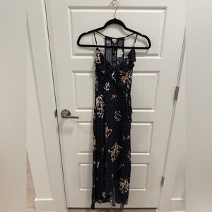 This elegant sundress by Lost + Wander features a flowing maxi length with a high-low hemline, perfect for a wedding guest. The dress showcases a beautiful blue base with a delicate tan floral print, complemented by spaghetti straps and a V-neckline for a romantic touch.