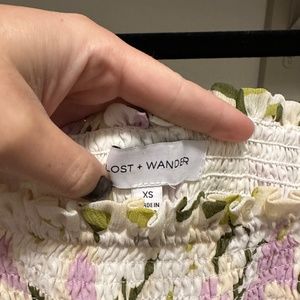 Lost + Wander floral dress (white, green, purple), size XS, ruched bodice, long sleeve