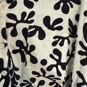 This linen blend button down top is in excellent condition. Front chest pocket. Boxy fit with a length of approximately 22.5” and pit to pit of 25”.
