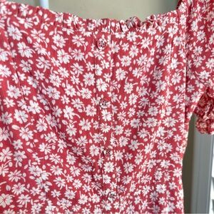 • Color is listed as coral, but it leans towards a muted red in my opinion. Ivory floral print.