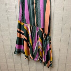 Lost + Wander Pandora green multi stripe satin asymmetrical ruffle dress, size Medium.