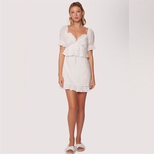 Look angelic this spring in the Petals of the Sky Mini Dress! This stunning silhouette features a sweetheart neckline with scallop trimming along the edges and a dainty tie. An eyelet cotton fabric shapes this peplum style dress with an exaggerated ruffle below the bust hem. More scallop edges can be found along the sleeves and the bottom of the skirt. Fully lined except the bubble sleeves and a back zip closure.