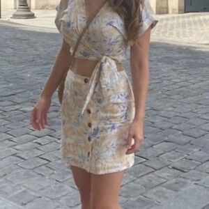 Beautiful yellow and white striped background with blue and white floral print. Button closure. Matching top in another listing. Wore mine (size S) in Paris!