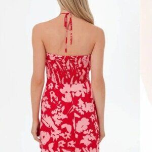 A brightly colored FARM Rio dress in a halter silhouette, ideal for sunny summer days. Flat sandals are an ideal accompaniment for this piece.