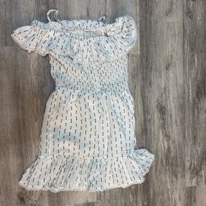 Keywords: white dress, mini dress, off shoulder, sleeveless, Lost + Wander, boho dress, summer dress, smocked dress, drawstring waist, tassel, casual dress, vacation dress, beach dress, ruffle trim