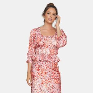 Live for beautiful adventures in the Wild Side Top! Satiny, pinks, cream, and lavender hues dot this special fabric and shape it into a long sleeved blouse with a scooped neckline, elastic tiered waist, and ruffled hemline.