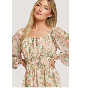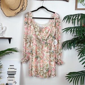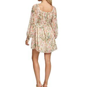Floral and leafy silhouettes in pastel hues pattern a long-sleeve minidress styled with a flattering smocked panel at the waist and ties at the square neck.
