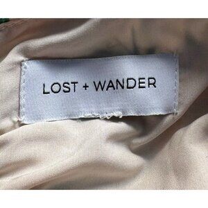 LOST + WANDER Ivory Floral Print Boho Tiered Ruffle Open Back Maxi Dress. Dress is cream and done in a green tropical leaf print. It has a halter neck with a tie back. The front is tiered with a slight ruffle detail. It's made of 100% rayon and is fully lined. Dress no longer has size tag but is measuring about a woman's size small. Please check measurements to ensure fit.