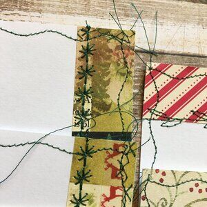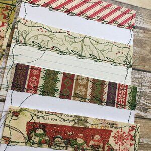 Handcrafted Lot of 10 Christmas Junk Journal Note Cards, perfect for scrapbooking, card making, or as unique holiday ephemera. Sewn designs add a personal, vintage touch to any craft project.