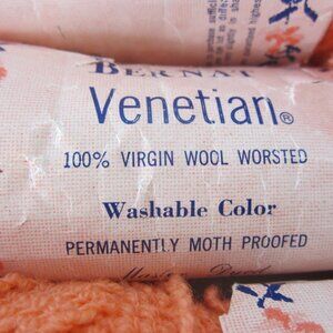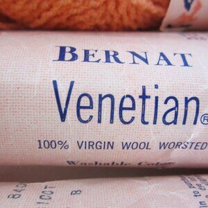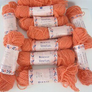 he product is a lot of vintage Bernat Venetian Apricot Orange 100% Virgin Wool yarn, 11 1 oz skeins. This yarn is washable and suitable for making accessories like gloves, hats, and scarves. It is of medium/worsted weight and in the color orange, made by the brand Bernat in the United States. The yarn is from the vintage Venetian Boucle collection and is a boucle style, perfect for crafting and needlecraft projects.