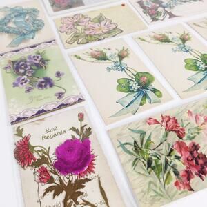 Features: These antique greeting postcards feature various florals. Many of the cards are embossed, one has a raised flocked rose. Several are German made.