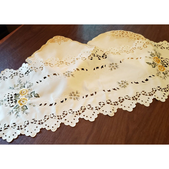 Lot 17: Embroidered Table Runner, Napkins, Placemats Beige. Napkins measure 19 x 18.25". Placemats measure 18.5 x 12.75". Table runner measures 43.25 x 15.25".