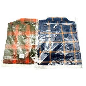 The product is a set of (2) Dixxon Flannel women's tops in size medium, featuring a plaid pattern in a Dark Blue and Red design. These long sleeve button-up shirts have a collared neckline and roll tab sleeves, made from 100% cotton flannel material. The Trailblazer and High Fives tops are machine washable and suitable for all seasons, making them versatile for winter, summer, fall, and spring. With button accents and easy care features, these tops also include pockets for added convenience.