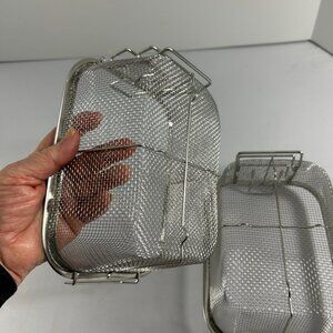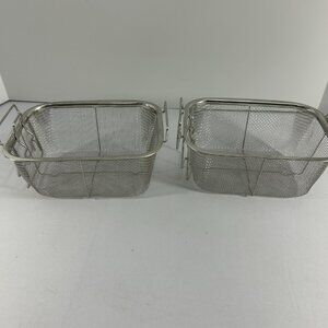 Lot 2 Fry Steamer Baskets Stainless Steel French Fries Potato Chips Strainer in very good preowned condition. Measures about 7.75" X 6.75" X 3.25" (outside measurements not including handles).