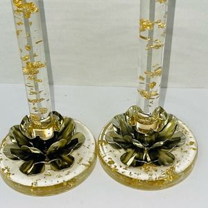 Lot 2 Lucite 12" Candles AND Candleholders gold flakes Enchanto Co of California