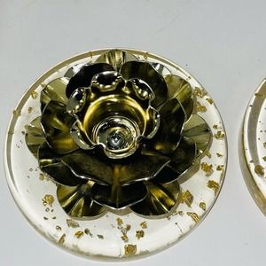 Beautiful condition gold tone flowers on lucite gold flakes bases candleholders.