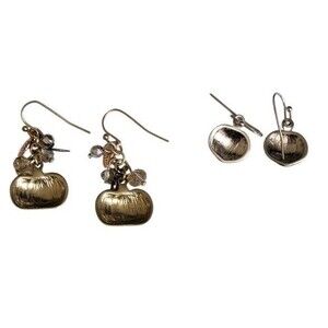 Lot of 2 pairs of autumn-themed pumpkin charm dangle earrings. The earrings are pumpkin in shape, multicolored, and made of metal. They feature a hook closure and are suitable for the earlobe or rook area. The design of the earrings is perfect for Halloween or fall celebrations, adding a festive touch to any outfit.