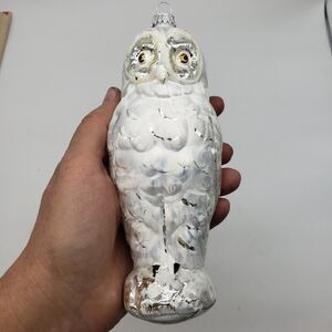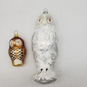 Lot 2 VTG Blown Glass Mercury Owl Christmas Ornaments- Germany & Czech Republic. The larger snow owl is marked Germany and the other small brown owl is marked Czech Republic.
