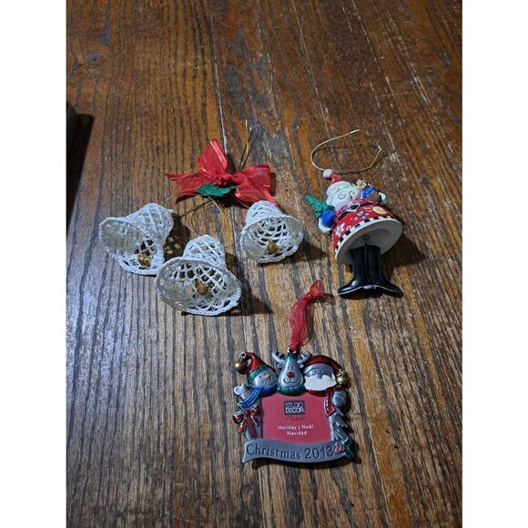 Good Used Condition Lot of Three Holiday Christmas Tree Ornaments. Off White Crocheted Type Three Bells, Santa Claus St Nick with Dangling Legs, and a Metal Photo Frame 2013