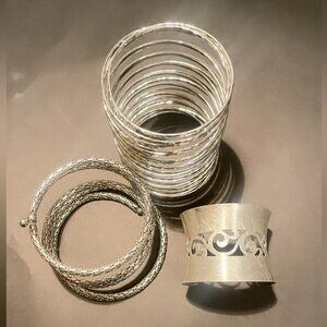 This collection features a variety of silver bracelets including delicate bangles with a textured finish and a wide cuff bracelet with a polished surface. Each piece showcases a unique design that reflects light beautifully, making them perfect for elevating any outfit. Ideal for both casual and formal occasions, these bracelets are a must-have accessory.