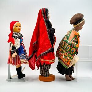 This lot includes 3 mid-century folk and cultural dolls, each dressed in traditional attire from a different region.