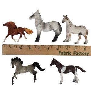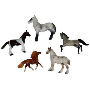 Three have been identified by Google Lens as Breyer Stablemates, one Shetland Pony, one Gray Stallion, and one Draft Red Leopard. Also included is a brown and white paint pony, and one black and grey resin horse. Excellent preowned condition. No chips or cracks. Comes from a smoke and pet free home. Please see pictures for more details.