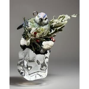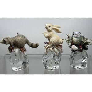 Lot of 3 Christmas ornaments. Bird, raccoon and bunny rabbit sitting/perched upon acrylic ice cubes. Bunny is tallest and is approximately 3" high, They each have a forest winter theme with snow, a bit of sparkles and winter foliage. Sold as shown, please see all photos.