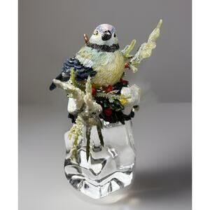Lot of 3 Christmas ornaments. Bird, raccoon and bunny rabbit sitting/perched upon acrylic ice cubes. They vary in heights, approximately 2.5 to 3" inches tall. They each have a forest winter theme with snow, a bit of sparkles and winter foliage. Sold as shown, please see all photos.