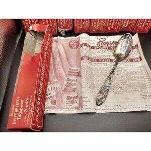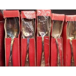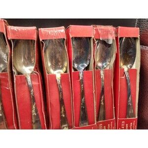 Up for sale is a lot of 10, brand new, Genuine New England Silverplate Teaspoons. With a beautiful pattern of the exclusive Rosemary, these are definitely sure to impress. Some still have the plastic wrapping on them, some don't. Most of them need to be cleaned from tarnish because of age. They are all brand new. 6" long is the perfect size for coffee, morning breakfast, or even mixing drinks.