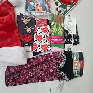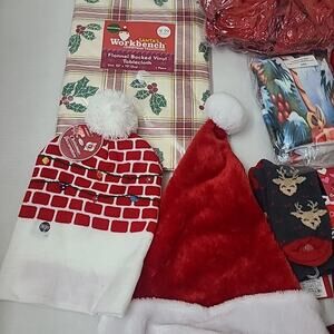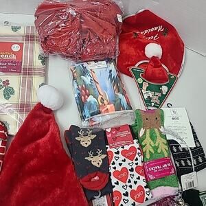 Lot Of 13 Christmas Holiday Items Hats Tablecloth Socks Tree Skirt Bows