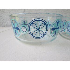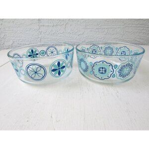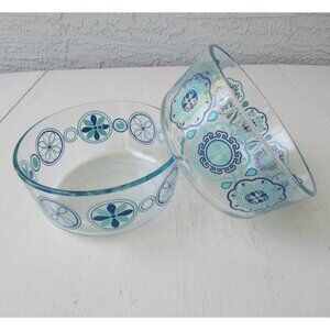 This set of two vintage glass bowls features a timeless design with blue and green floral patterns. Ideal for serving or decorative use.
