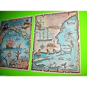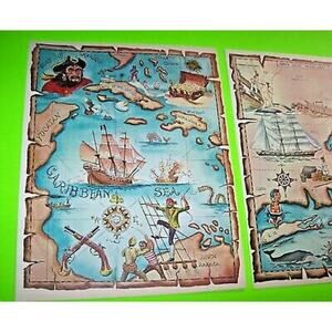 Set of (2) matching vintage art prints. Size is 10 1/4 inch X 13 1/8 inch each. They have nice color and have the Pirates of the Caribbean / treasure maps / sea monsters theme. Ready for framing. They are in near mint condition with mild age wear. See photos.