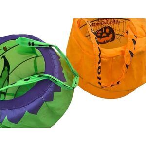 Lot Of 2 Collapsable Pumpkin Trick Or Treat Buckets Halloween Spooky Holiday