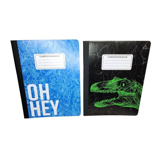 Enhance your school experience with this lot of 2 composite dinosaur and 'Oh Yeah' designer notebooks. These high-quality, unique notebooks are perfect for students seeking functional and stylish stationery.