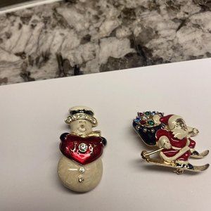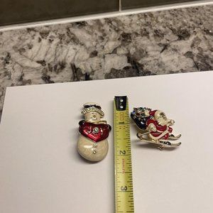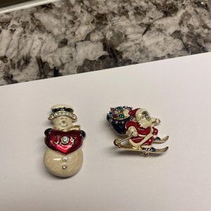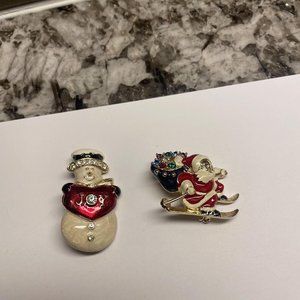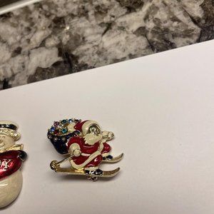 Lot Of 2 Gold Tone Christmas Holiday Brooch Pins Enamel Santa On Sleigh /Snowman